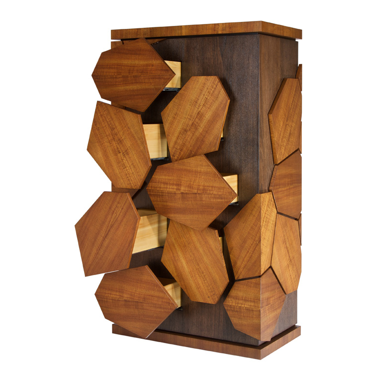 “The seven drawers are made from Hydrowood Celery Top Pine, featuring hand-cut dovetail joints. LED lighting illuminates various details when the drawers are opened and internal voice recordings further describe the piece and the unique timber it’s made from.”